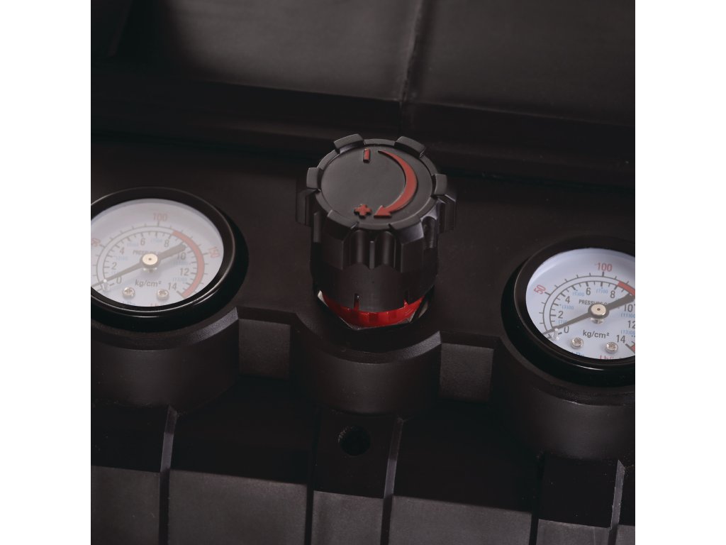 - Dva manometry: Jeden pro zobrazení tlaku v nádobě a druhý pro pracovní tlak, což zajišťuje přesnou kontrolu nad výkonem kompresoru.