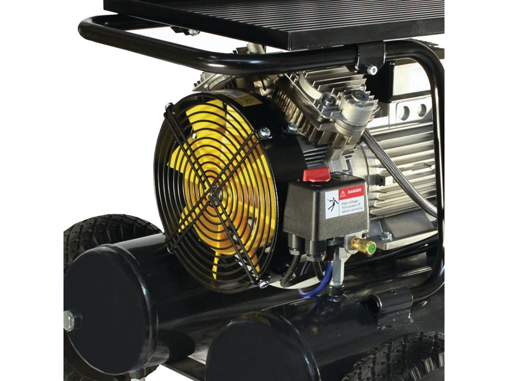 - Mobilita: Kompresor je vybaven trubkovým rámem ve tvaru trakaře, který chrání zařízení a zajišťuje snadnou manipulaci.