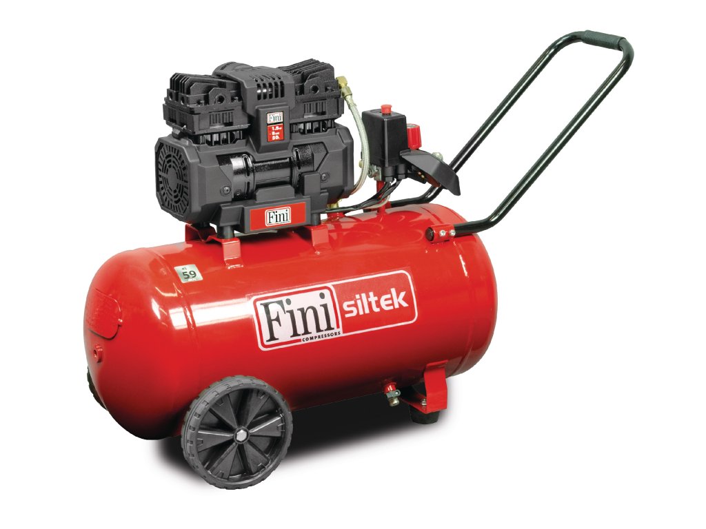 Bezolejový pístový kompresor Fini Siltek TB50/1,5 HP na 50l vzdušníku. Velmi nízká hlučnost, pouze 59 dB(A), je ideální používat kompresor například v restauracích k čepování piva. Dále je vhodný k dofukováí kol, ofukování v dílně, jako zahradní pomocník, čištění nářadí, vyfukování závlah a podobné menší práce.