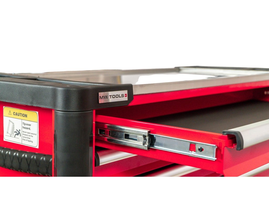 Pracovní deska je vyrobena z nerezové oceli a má 4 úložné přihrádky na drobné vybavení. Tento kufr je také vybaven pryžovými nárazníky na všech 4 rozích. Každá zásuvka je vhodná pro pěnové vaničky MW TOOLS.
