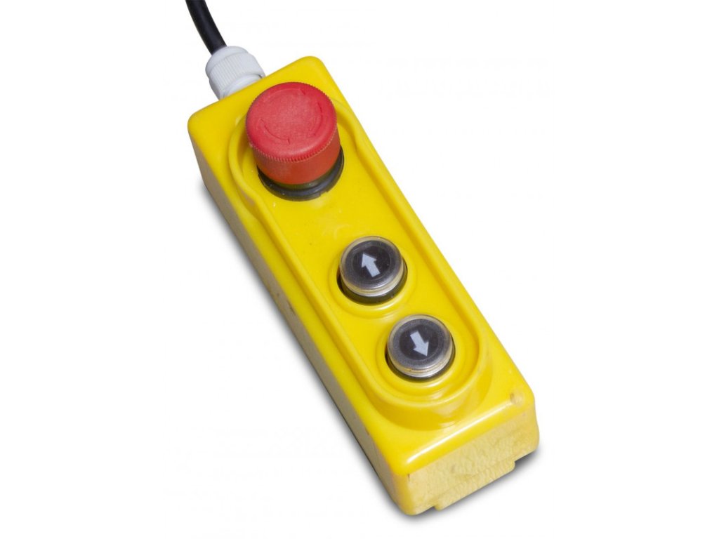- 24V přenosné dálkové ovládání s tlačítkem nahoru/dolů a nouzovým zastavením. 3metrový kabel umožňuje snadné ovládání můstku z jakékoli pozice.