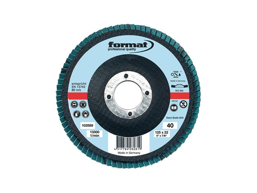 Provedení: Zirkonkorundové lamely (ZA) s multi-pojivem. Agresivní provedení, vysoce pevné usazení pryskyřicovým pojivem s kotoučem ze sklotextilu, vypouklý o 6° . Bez obsahu železa, síry a chlóru v pojivu. Normovaný otvor 22,23 mm.