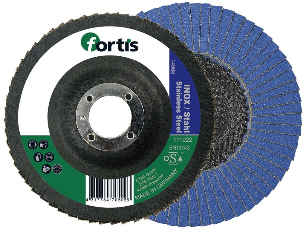 Provedení: Zirkonkorundové lamely (ZA). Agresivní provedení, vysoce pevné usazení pryskyřicovým pojivem s kotoučem ze sklotextilu. Bez obsahu železa, síry a chlóru v pojivu. Velmi vysoká rychlost odebírání materiálu a dobrá životnost. Normovaný otvor 22,23 mm.