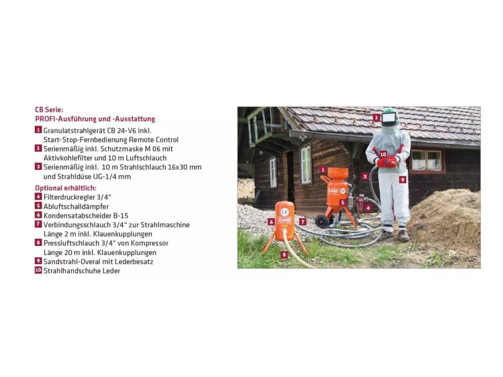Mobilní pískovačka CB215 F-D2, set s hadicí, maskou a dálkovým ovládáním