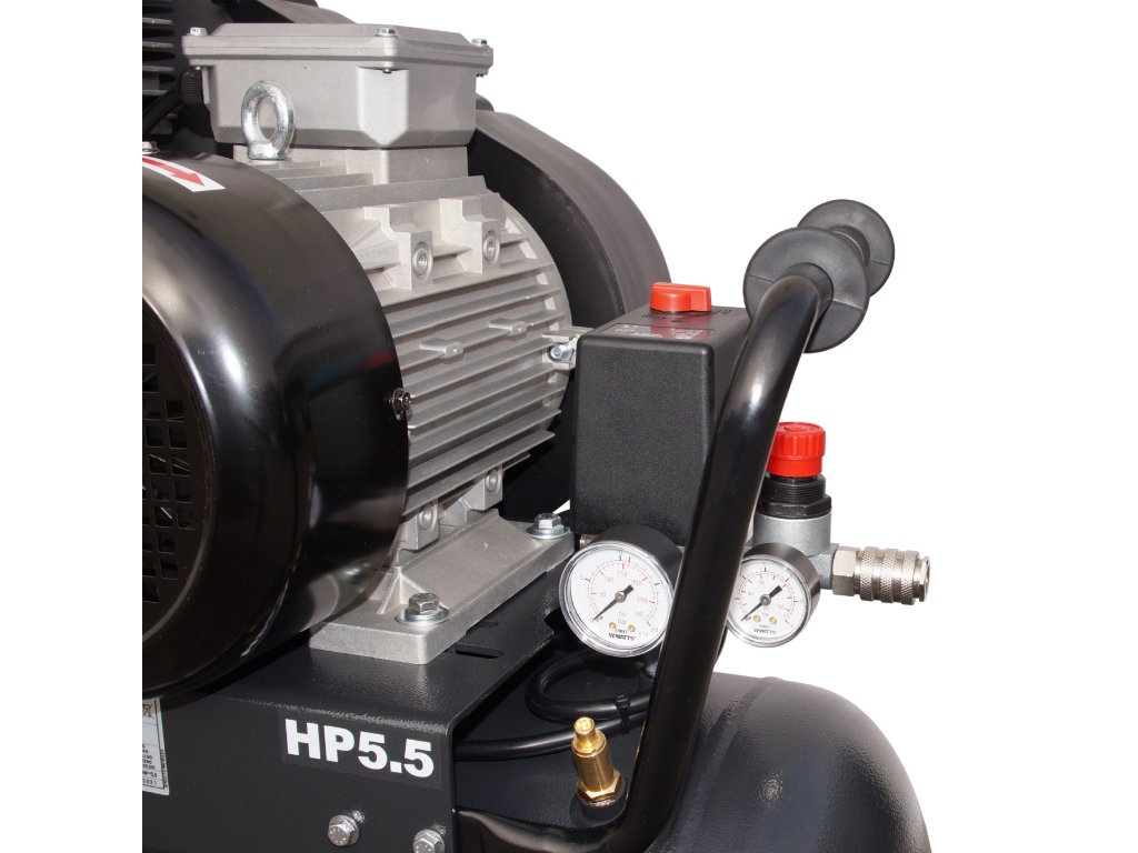 Dvouválcový řadový agregát: Kompresor je vybaven dvouválcovým řadovým agregátem, který je poháněn klínovým řemenem. Tento pohon zajišťuje stabilní a efektivní přenos výkonu, což přispívá k celkové efektivitě kompresoru.