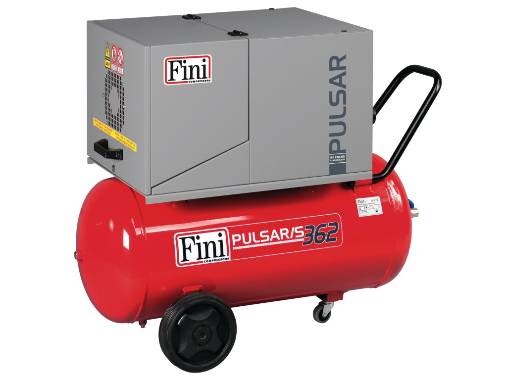 Tichý pístový kompresor Fini PULSAR/S 362-M-90 na 90 litrové nádobě a elektrickým připojením na 230 V. S plnícím výkonem 174 l/min. Vzhledem k nízké hlučnosti vhodné pro uživatele, kde potřebují tiché prostředí.