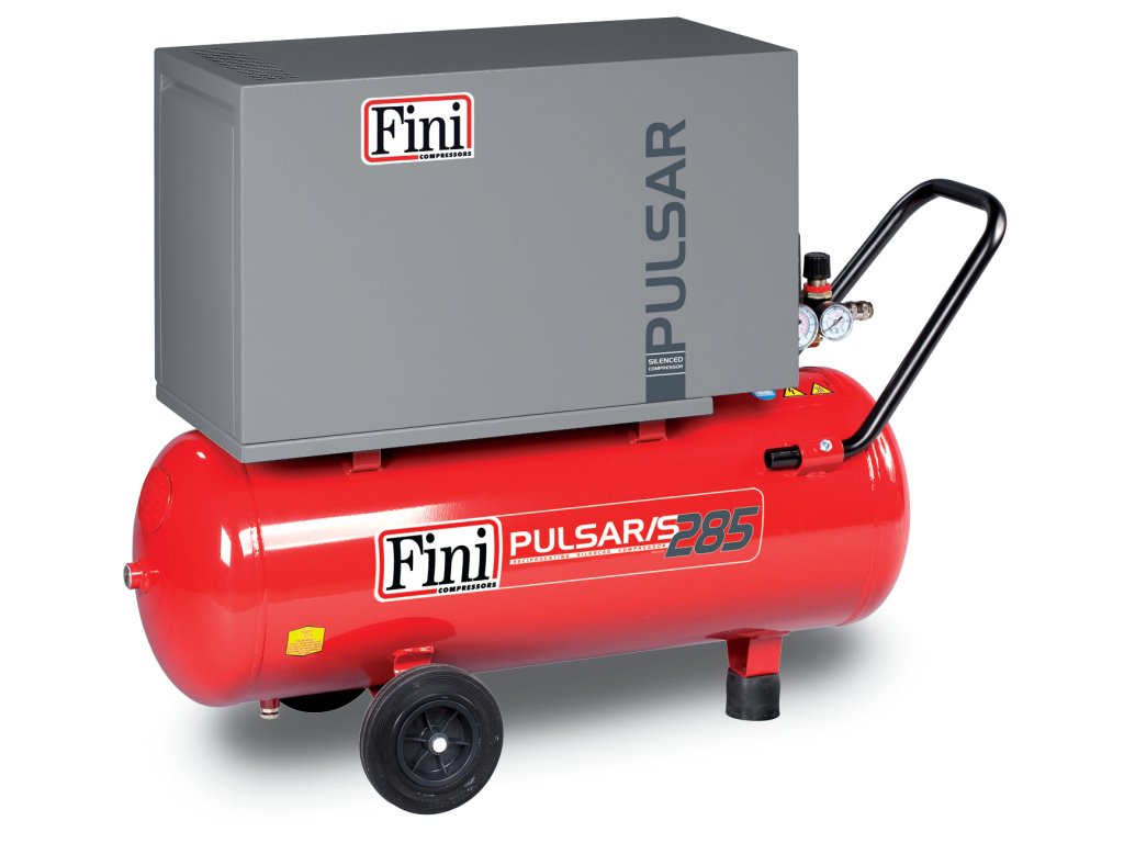 Tichý pístový kompresor Fini Pulsar/SN 285M-50 na 50 litrové nádobě a elektrickým připojením na 230 V. S plnícím výkonem 170 l/min. Vzhledem k nízké hlučnosti vhodné pro uživatele, kde potřebují tiché prostředí.