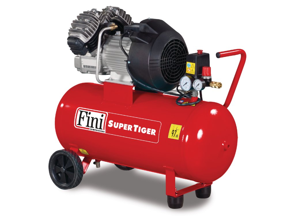 Pístový kompresor Fini SuperTiger VKM4020-3M na 230V s 50l tlakovou nádobou a plnícím výkonem 215l/min. S dvouválcovým , jednostupňovým agregátem do V. Vhodný pro domácí práce kolem domu, v dílně i do menších řemeslnických dílen na ofukování, sponkování, hřebíkovačky atd.