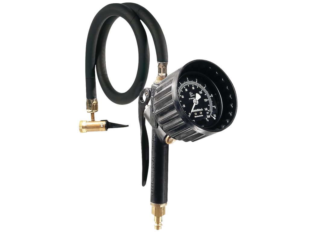 - Manometr s kovovým pouzdrem, ochranným uzávěrem, s dvojitou stupnicí, rozsahy zobrazení: 0 – 10 bar (0 – 140 psi), dělení 0,1 bar, přesnost zobrazení dle DIN EN 12645