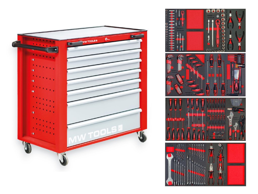 Každý nástroj MW TOOLS je na svém místě, což zaručuje zvýšenou efektivitu, komfort a bezpečnost . Můžete tak bezpečně přistupovat k požadovaným nástrojům přímo, aniž byste ztráceli čas , protože požadované nástroje jsou uloženy na správném místě . Díky tomuto optimalizovanému uložení v kompletní skříni na nářadí MW TOOLS již odpadá přerušení a prostoje při hromadném hledání vašich nástrojů.