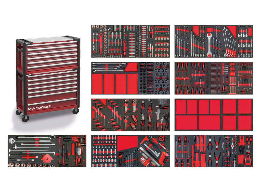 Každý nástroj MW TOOLS je na svém místě, což zaručuje zvýšenou efektivitu, komfort a bezpečnost. Můžete tak bezpečně přistupovat k požadovaným nástrojům , aniž byste ztráceli čas , protože požadované nástroje jsou uloženy na správném místě. Díky tomuto optimalizovanému uspořádání v kompletním nástrojovém dílenském vozíku od MW TOOLS již nedochází k přerušení a prostojům při hledání nástrojů v zásuvce.