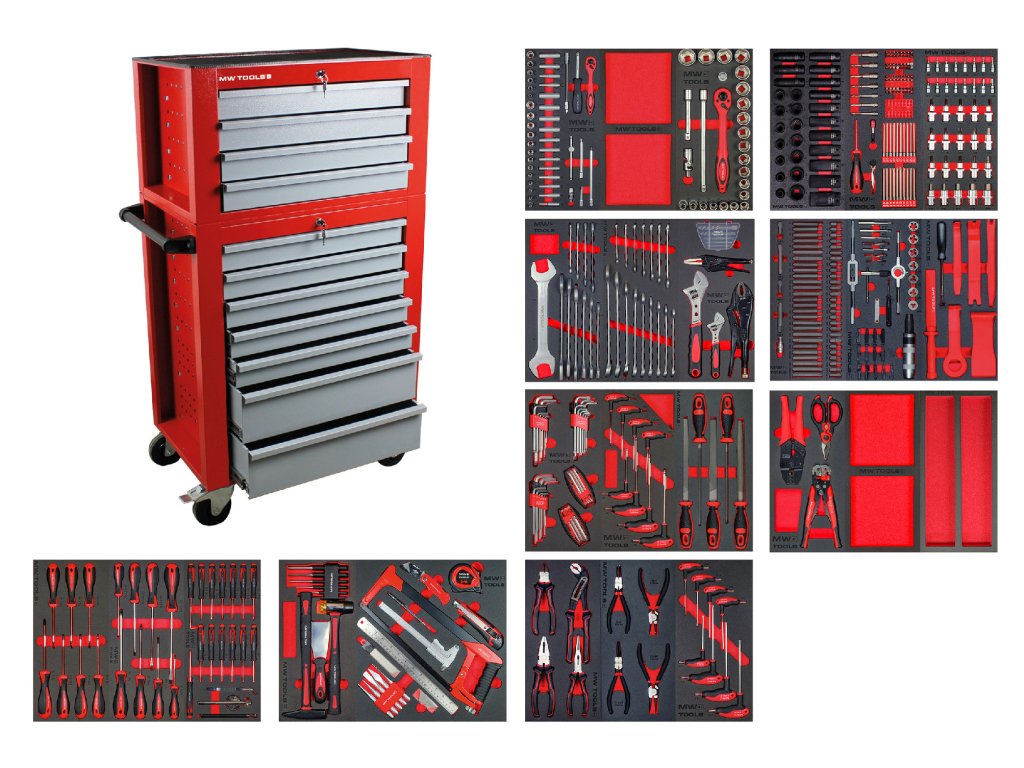 Každý nástroj MW TOOLS je na svém místě, což zaručuje zvýšenou efektivitu, komfort a bezpečnost . Můžete tak bezpečně přistupovat k požadovaným nástrojům přímo, aniž byste ztráceli čas , protože požadované nástroje jsou uloženy na správném místě . Díky tomuto optimalizovanému uložení v kompletní skříni na nářadí MW TOOLS již odpadá přerušení a prostoje při hromadném hledání vašich nástrojů.