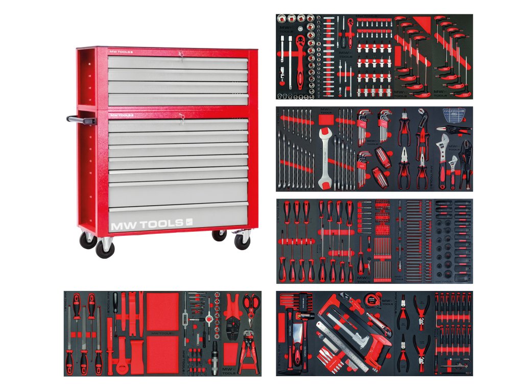 Každý nástroj MW TOOLS je na svém místě, což zaručuje zvýšenou efektivitu, komfort a bezpečnost . Můžete tak bezpečně přistupovat k požadovaným nástrojům přímo, aniž byste ztráceli čas , protože požadované nástroje jsou uloženy na správném místě . Díky tomuto optimalizovanému uložení v kompletní skříni na nářadí MW TOOLS již odpadá přerušení a prostoje při hromadném hledání vašich nástrojů.