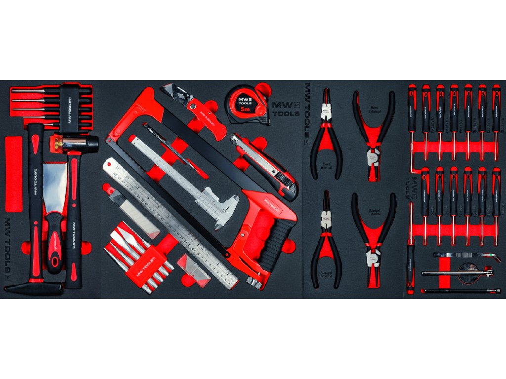 Červený a černý pěnový modul MW TOOLS vám umožní uspořádat a úhledně uložit vaše nářadí ve vaší skříni.