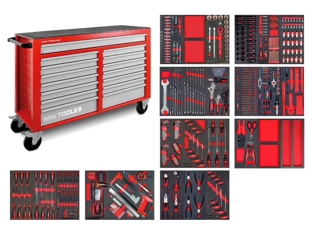 Každý nástroj MW TOOLS je na svém místě, což zaručuje zvýšenou efektivitu, komfort a bezpečnost . Můžete tak bezpečně přistupovat k požadovaným nástrojům přímo, aniž byste ztráceli čas , protože požadované nástroje jsou uloženy na správném místě . Díky tomuto optimalizovanému uložení v kompletní skříni na nářadí MW TOOLS již odpadá přerušení a prostoje při hromadném hledání vašich nástrojů.