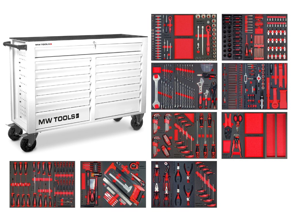 Každý nástroj MW TOOLS je na svém místě, což zaručuje zvýšenou efektivitu, komfort a bezpečnost . Můžete tak bezpečně přistupovat k požadovaným nástrojům přímo, aniž byste ztráceli čas , protože požadované nástroje jsou uloženy na správném místě . Díky tomuto optimalizovanému uložení v kompletní skříni na nářadí MW TOOLS již odpadá přerušení a prostoje při hromadném hledání vašich nástrojů.
