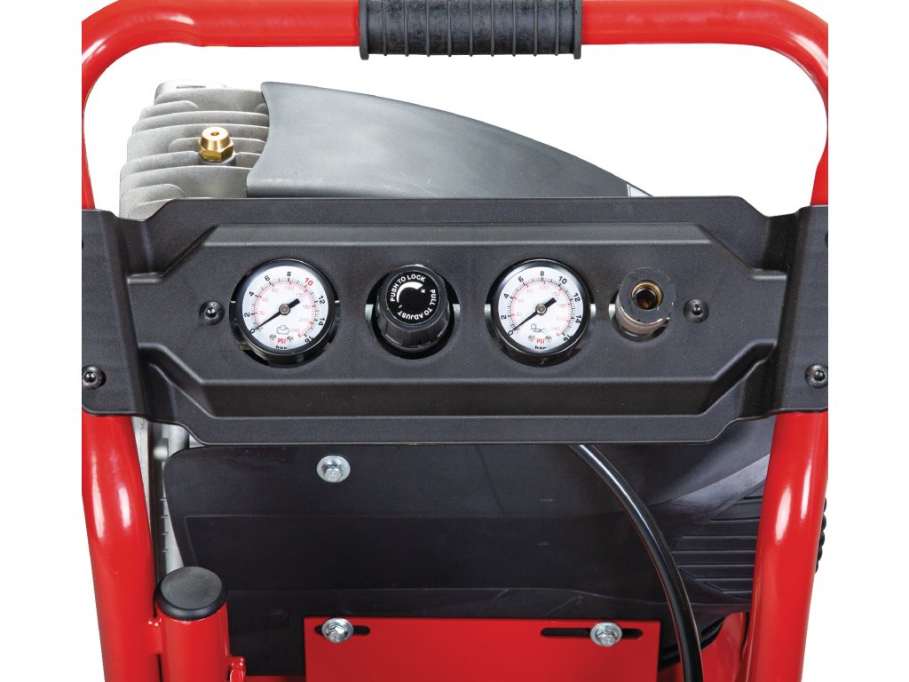 Přehledný a srozumitelný ovládací panel. Dva manometry. Regulátor tlaku pro plynulé nastavení tlaku. Rychlospojka pro připojení stlačeného vzduchu.