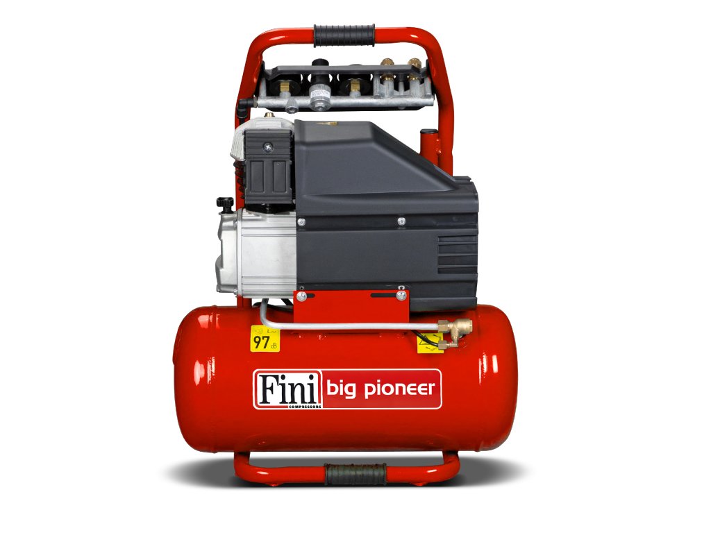 Pojízdný pístový kompresor Fini Pioneer 312M s 24l tlakovou nádobou. Přehledný panel umožňuje snadnou regulaci a k připojení vzduchu jsou tam dvě rychlospojky. Snadná manipulace a převoz na stavbách, díky širokému rozvoru a velkým kolům.