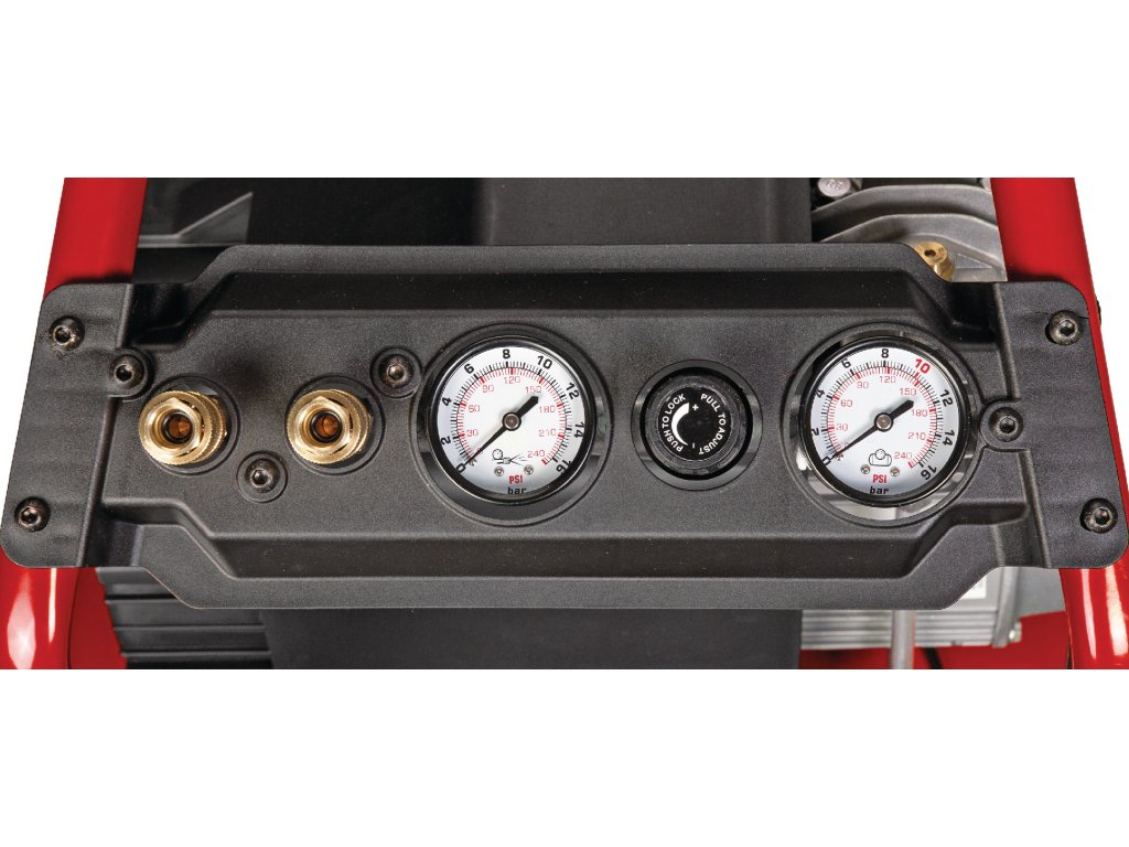 Přehledný a srozumitelný ovládací panel. Dva manometry. Regulátor tlaku pro plynulé nastavení tlaku. 2 x rychlospojka pro připojení stlačeného vzduchu.