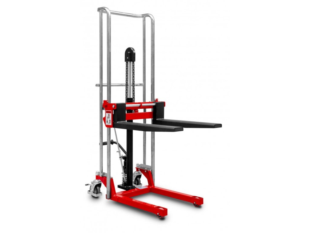 Ruční zakladač s nosností 400 kg s vidlemi a ložnou plochou, výška zdvihu 1500 mm.
