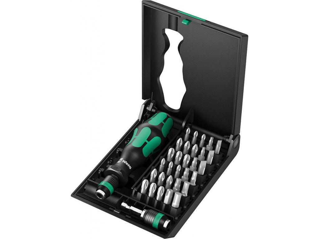 Provedení: S houževnatými bity. Rukojeť Kraftform-Plus z nárazuvzdorného plastu s integrovanými měkkými plochami pro lepší uchopení, s ochranou proti odkutálení je vybavena rychlovýměnným sklíčidlem Rapidaptor. Tím jsou bity pevně spojeny s rukojetí a neviklají se, navzdory tomu je však lze rychle vyměnit. S volnoběžným pouzdrem pro jednoduché držení při strojním šroubování. Bity a rukojeť jsou přehledně uspořádány v plastovém boxu.