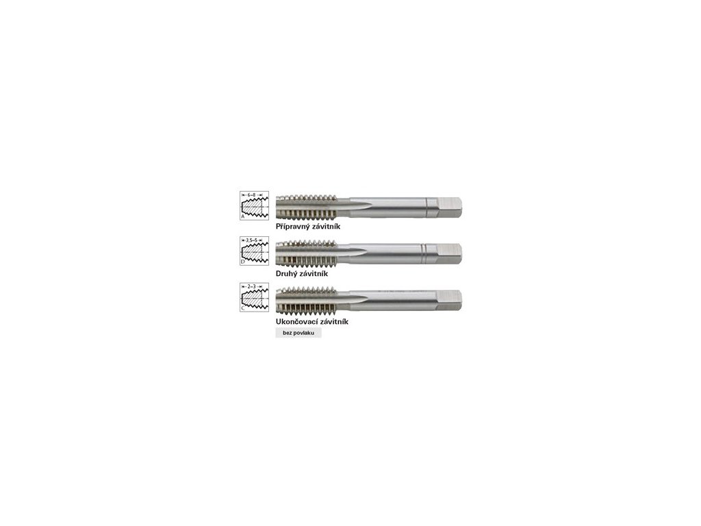 Provedení: Obsah 3-dílné sady: přípravný závitník s nářezem ve tvaru A (6–8 chodů), druhý závitník s nářezem ve tvaru D (3,5–5 chodů) a ukončovací závitník s nářezem ve tvaru C (2–3 chody).