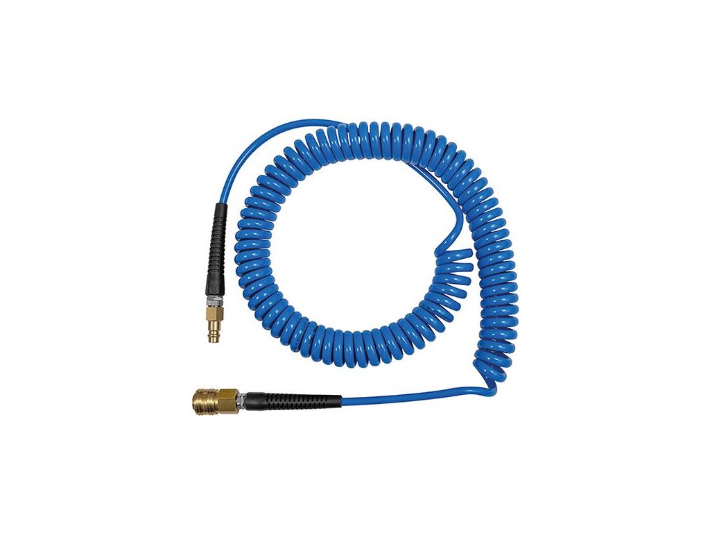 Provedení: Oboustranně spojená s pružinou proti zalomení, s rychlospojkou a vsuvkou jmen.sv. DN7,2. Elastická polyuretanová hadice má velmi velkou sílu vrácení do původní polohy, je prostorově úsporná díky malým vinutím a snadno se s ní manipuluje. Hadice má dobrou absorpci vibrací a vynikající odolnost proti oděru.