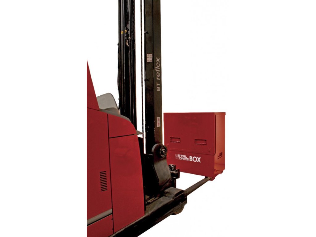 Vysoký kovový stavební box, který lze přemisťovat vysokozdvižným vozíkem.